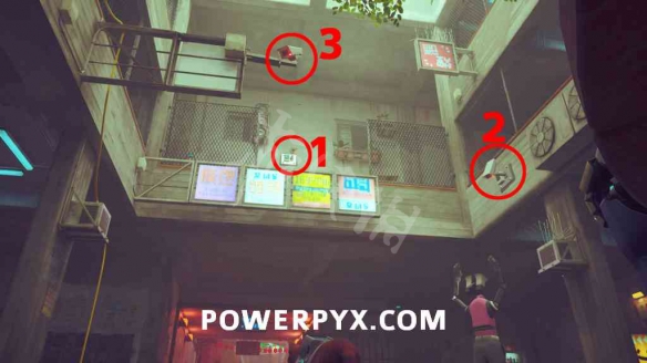 只需上一層樓並跳上每個攝像機,然後它們就會立即掉下來。一台攝像機位於公寓大樓入口上方(必須爬上旁邊的箱子),一台在左側,一台在大廳右側(跳過欄桿即可到達)。
