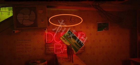 位於市中心的酒吧“Duffer Bar”。酒吧牆上有一個霓虹燈招牌,上面寫著“Duffer Bar”。與標誌互動,圖片會掉落。現在您可以閱讀牆上的代碼,密碼:1283。