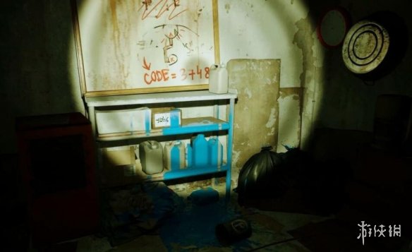 出去的門需要密碼,打開手電筒進入旁邊漆黑的房間,推開油漆桶,看到牆上的密碼:3748