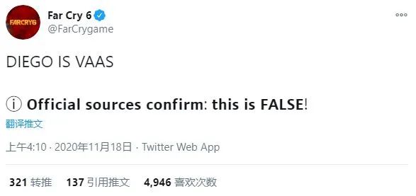 對這樣的傳聞,《孤島驚魂6》官方推特也做出正式回應,表示這個猜測是錯誤的: