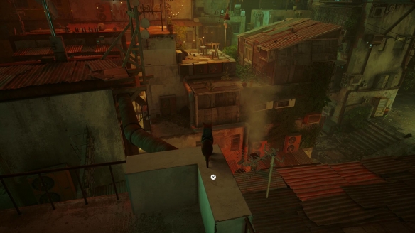 就拿「貧民窟」來說,乍看之下到處都是些平平無奇的矮樓。但玩家操控貓咪時可以藉助地面的售貨機、店鋪招牌作為踏板,沿著樓外的窗棚、空調外機通往樓頂。同時樓宇天台之間有木板、頂棚相銜接,這些設施本身與整個場景渾然一體,通道、路徑環環相扣。看似普普通通的場景,內里卻暗藏玄機,置身於其中的探索體驗還是相當有趣的。