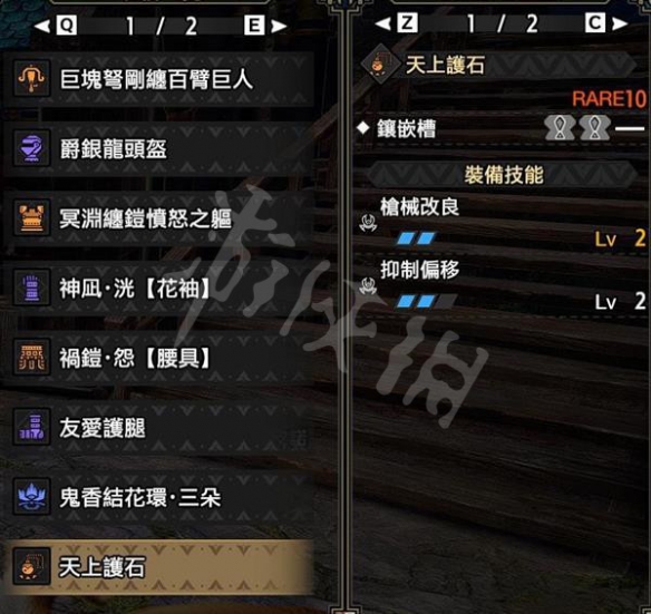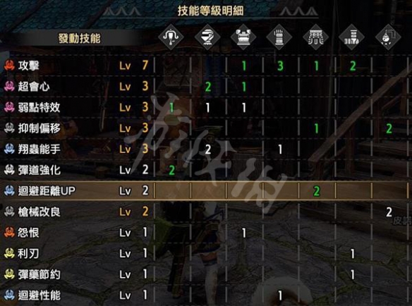 不需要彈種強化什麼的,所以就採用現在面板最高的業鎧+狂龍,再把相關的彈道強化、翔蟲能手、攻擊、會心相關等等都配出來,大推回距2~3,M位輕弩神技。