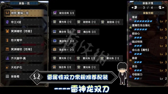弱點特效2:有S2插槽的推薦,將胸換成電龍鎧甲,優先滿看破,滿會心擊【屬性】保證傷害,用耐力急速恢復代替跑者,剩餘的S2考慮加滿耐力急速恢復或跑者1。