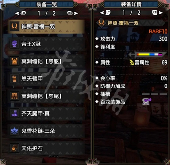 連擊2:有S2插槽的推薦,將腰帶換成迅龍腰帶,優先滿看破,滿會心擊【屬性】保證傷害,跑者可以根據剩下的孔位進行調整考慮。