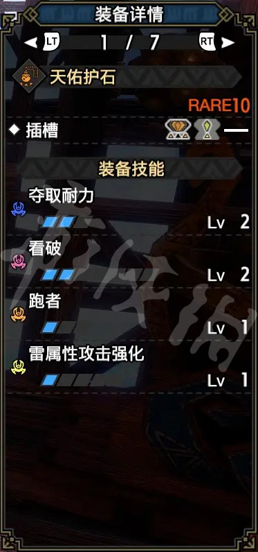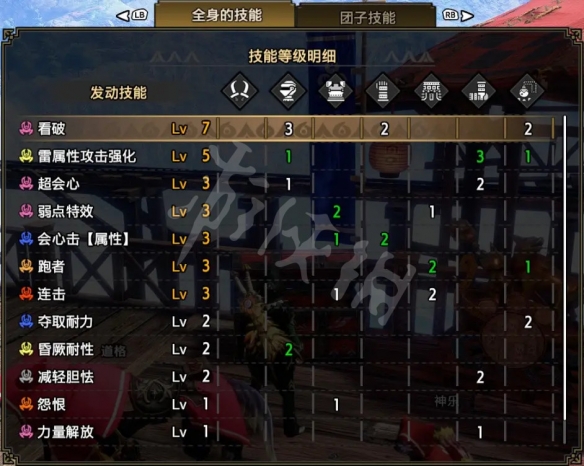 技能:看破7,雷屬性5,超會心3,弱點特效3,會心擊【屬性】3,跑者3,連擊3,奪取耐力2,昏厥耐性2,減輕膽怯2,怨恨1,力量解放1,激昂1