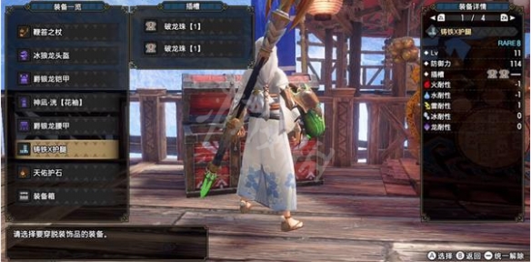 蟲棍是一把安全係數很高的武器能飛天能走地,三燈能加防禦,那麼代價是什麼,代價就是刮痧。既然我就想反正都這麼安逸了,不如就上一些高風險高回報的裝備。所以頭我選擇了天徊龍的頭,冥淵三件,再搭配火龍腰。