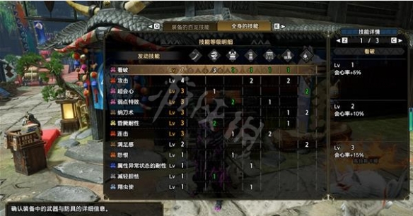 技能方面因為日常狩獵居登但是多人玩的時候還是習慣櫻花接神威的無腦打法,暫時配上了連擊3,匠2可能不太夠,所以其中那個龍屬性攻擊5實際佔用了S4+S2孔位,等日後可能會補換成匠,或者換成防禦5提高一下容錯率,目前體感防禦力還是有點低(自己太菜了),但是有滿足感2葯王打法也能接受。
