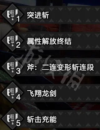 1號位突進斬和突進直斬,熟練的情況下突進直斬更好用;突進斬掏刀快,搭配斬擊充能,在劍槽能量不夠用時快速回復。當然一般也不用,二連變形斬回復的就夠了。