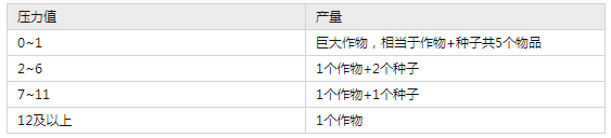 作物成熟時累積的壓力值將決定產量。累積壓力值越大,產量越少。只有壓力值在0~1的作物才會長成巨大作物。但這種影響有限,無論壓力是多少,一個種子最終都會至少獲得一個作物。具體如下表: