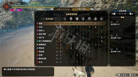 護石還是納2s22,不太用的來抖擻,所以還是選了挑2,其他技能可以出到見7攻4超心3弱特3納刀3翔蟲使3,還附帶一個怨恨和連擊。