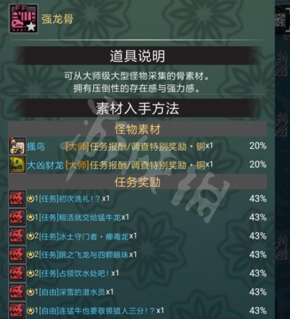 此外,玩家完成任務也能獲得強龍骨作為任務獎勵。如初次洗禮、佔領飲水處吧、深雪的潛水員這些自由任務都有43%的概率獲得強龍骨。強龍骨的作用是可以在武器強化項目中作為消耗材料使用。