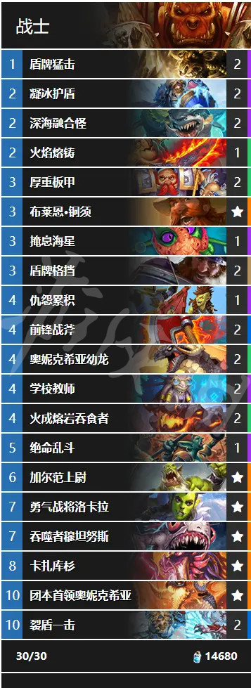 這套防戰相較於削弱前做了不小調整,除了繼續保留了不可替代的裂盾一擊外,學校教師也是全數保留了,控制卡組也並不需要教師的身材來賺節奏,學生學習到高費的戰士法術還是非常賺的,也足夠靈活,它才是本體。
