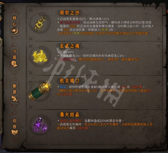 萬用的一號和二號位不動,三號位選擇機關噴口,四號位選擇墨火結晶,武器太祖可以刷一下火焰傷害或者近戰傷害,帶著機關噴口,小怪可以不用管,只管自己瞬身趕路就可以。