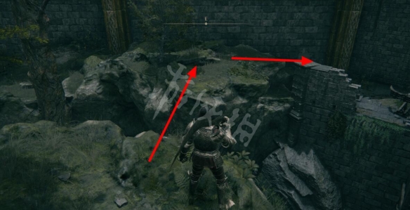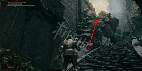 利用台階左側的石頭到達上方平台,消滅沿途遭遇的敵人。