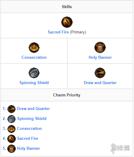 灼熱:強化聖火,持續12秒,增加對X到Y的傷害。每殺死一名敵人,聖火傷害提高1%,持續240秒,最多疊加10次。您還將獲得一個可吸收傷害的護盾。