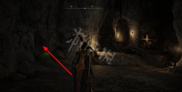 一路深入洞窟來到下圖所示位置後,左側草叢處的牆壁為隱藏門。