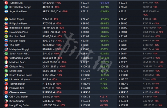 游戲的國區售價為125.1元,目前全部區服中售價最低的區為土耳其,僅售57元。