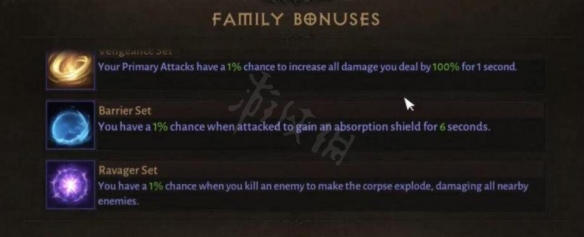 套裝湊齊屬性:當擊殺一個敵人時,你有 1% 的幾率讓屍體爆炸,對附近所有敵人造成傷害