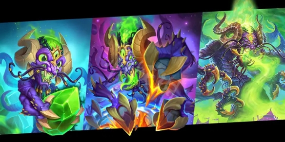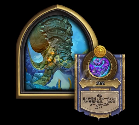 觸鬚:被動。戰斗開始時:召喚一條2/2並具有嘲諷的觸鬚。(在你出售一個隨從後升級!)
