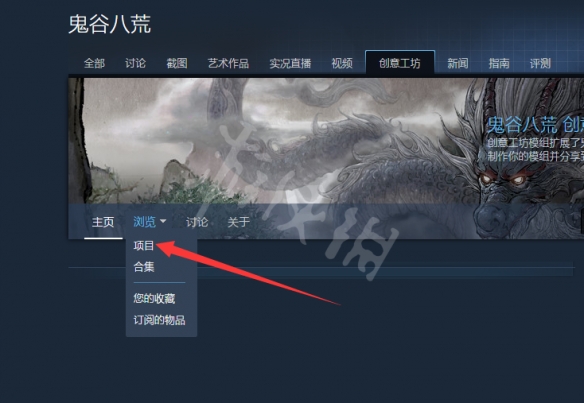 3、進入創意工坊後,找到【瀏覽】按鍵,點擊子目錄中的【項目】,即可查看當前創意工坊中所有可玩MOD。