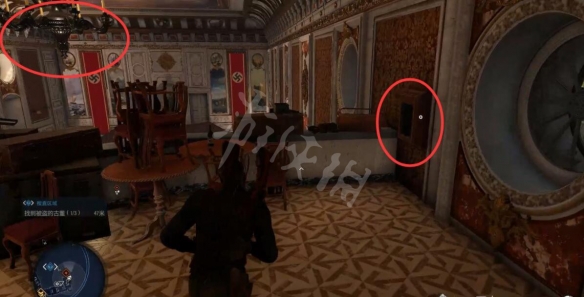 上舞廳二樓,待庫姆勒停在枝形吊燈下時,破壞枝形吊燈砸死他。然後搜刮屍體得到“穆勒的辦公室鑰匙”。
