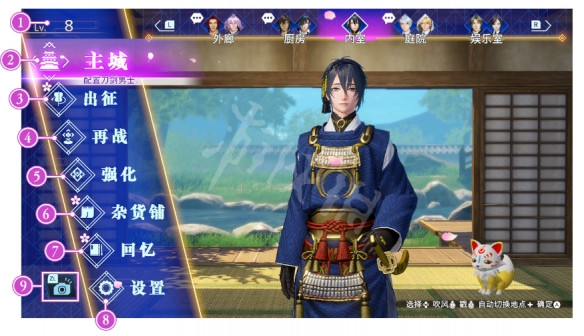 在主城中,你可以分別在“內室、廚房、庭院、外廊、娛樂室”中配置刀劍男士。