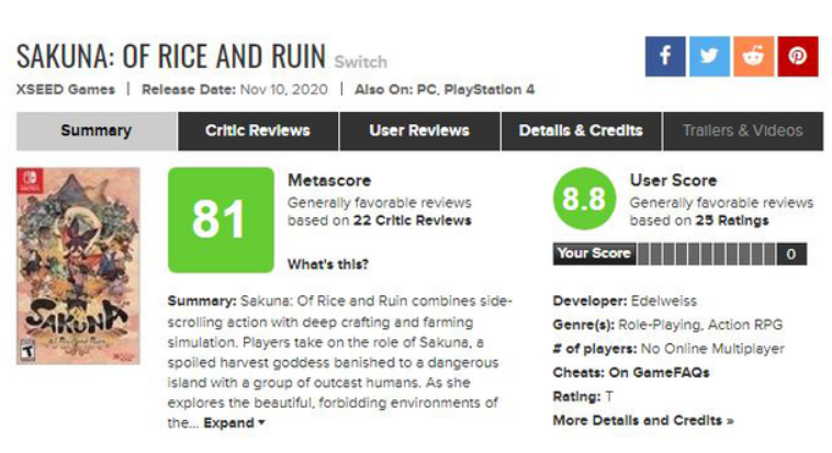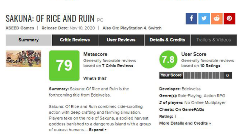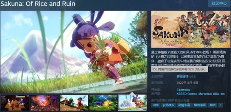 同時,《天穗之咲稻姬》的口碑也相當不錯,媒體平均分和玩家評價均在80分左右,Steam