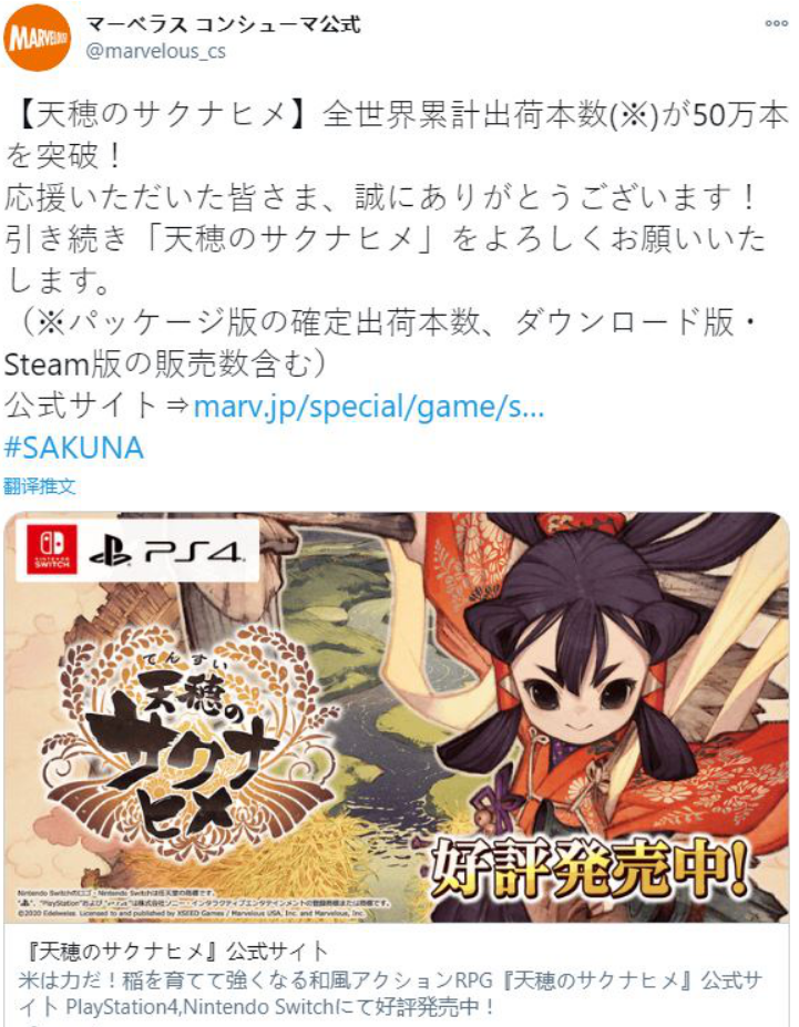 遊戲發行商Marvelous今日在官方推特公布了《天穗之咲稻姬》的最新銷售數據。截至正式發售兩周之後,《天穗之咲稻姬》的全球向量已經突破了50萬,其中包含實體版、數字版和Steam平台的銷售數量。
