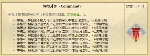 至於領導術,我的建議是初期沒必要升,3隊兵足夠你度過前中期,到了中期(對於巴里亞來說就是火槍、長矛、工匠三大主力都有升級版了以後)開始主力必須要升到4領導了,到了後期則必須是5領導起步,甚至是6領導或者更多。