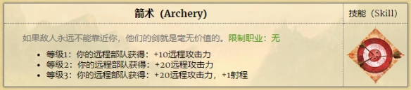 箭術對於巴里亞派系的重要性主要就在於那+1射程,因為巴里亞本身的2大遠程輸出兵種全都需要在每次射擊之後花費一回合進行裝填,因此如何有效利用這寶貴的2回合打一次敵人的機會,對於想要玩巴里亞的玩家來說簡直是必修課。因此凡是能夠+1射程的,統統是好東西,因為可以極大地提高你的部隊容錯,讓你更容易取得戰斗勝利。