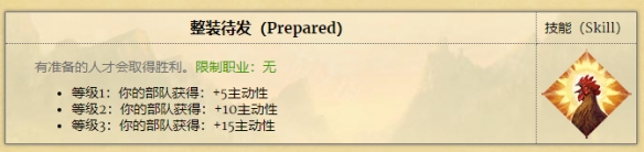除了箭術,對巴里亞英雄來說第二重要的技能就是整裝待發,由於巴里亞的主戰兵種火槍和長矛的主動性偏低,因此要盡可能地提高軍隊的主動性,提高在戰斗中先手的概率。