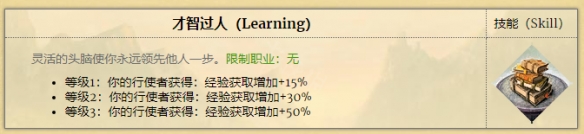 至於才智過人這個技能,其實效果拔群,3級才智+50%經驗,變相等於升級所需時間要減少1/3,而這個游戲目前基本上是不缺經驗值的,一般打到中後期,電腦遍地的英雄隨便滅掉一個就是一兩千的經驗,而如果你的主力有個才智過人,動輒就是兩三千甚至三四千。即使是10級以後升級所需經驗明顯增多了依然可以打上2~3次戰斗就升一級,不可謂不劃算。