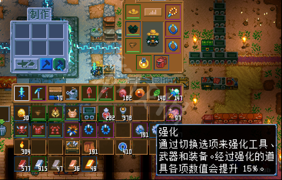 需要在修理桌處進行強化(綠色鎚子按鈕)