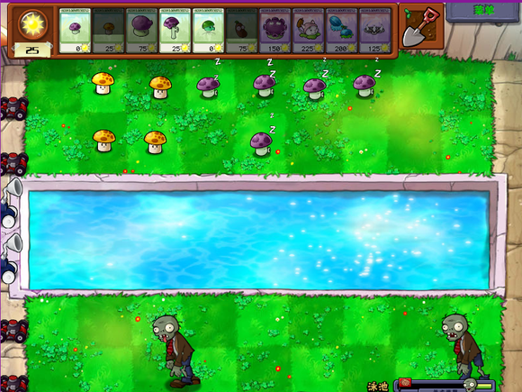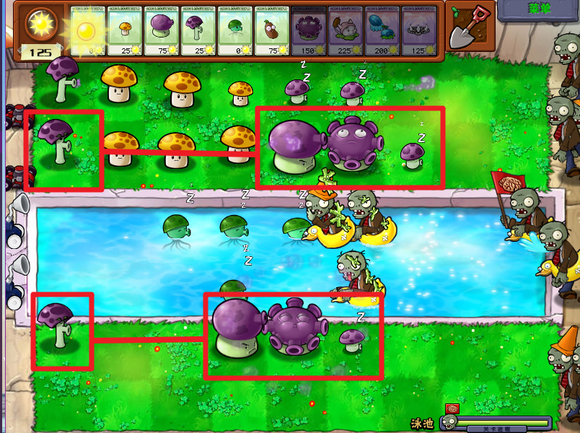 開局只守一邊,種六個陽光菇,最後面放兩個膽小菇就行了,前面放滿小噴菇,水裡同樣只守一邊;
