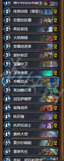 在新補丁整體環境都降速的情況下,該套具有一定強度,只要你的牌序夠好,五費前可以拍小怪,然後5費拍體格訓練+一隻三費怪,下一回合打出奔赴前線+343+嘲諷怪的配合,或者費林大使+深海來客+芬利,後期可以先拍奈利,等1費海盜到手,再配合重拳斬殺。