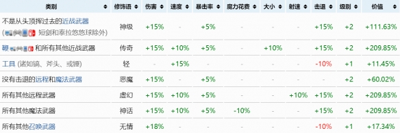 整體上來說,最好的近戰修飾語是傳奇,但它只適用於闊劍和短劍。對於所有其他近戰武器(諸如矛、連枷、悠悠球、和腐化者之戟之類的獨特近戰武器),最佳修飾語是神級或惡魔。泰拉悠悠球可以得到一個它獨享的特殊版傳奇修飾語。