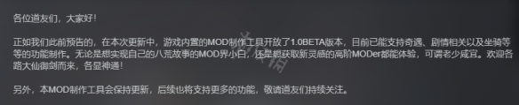 近期,官方在更新中開放了遊戲內置的MOD製作工具1.0BETA版本,屬於一個第三方的平台的產品,目前已能支持奇遇、劇情相關以及坐騎等等的功能製作。