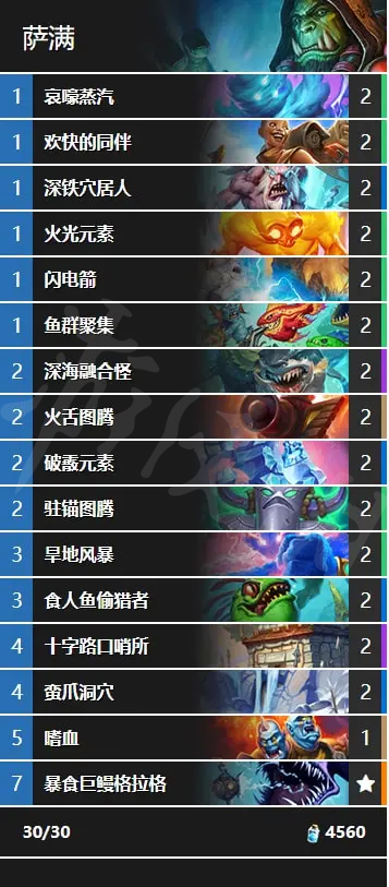 看到無比熟悉又陌生的嗜血,就知道這是一套鋪場系的薩滿卡組。卡組中低費曲線密集,很神奇地集齊了多個種族,冰薩最得意的元素,薩滿“專屬”的圖騰,魚人和食人魚,以及巨型野獸暴食巨鰻格拉格,這也讓深海融合怪成為了一個真正的融合怪。