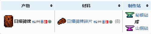 日耀碑牌是一個困難模式下用於召喚日食的消耗品。它只能在白天期間使用,使用後會立刻召喚日食,日食會一直持續到當天的下午 7:30。
