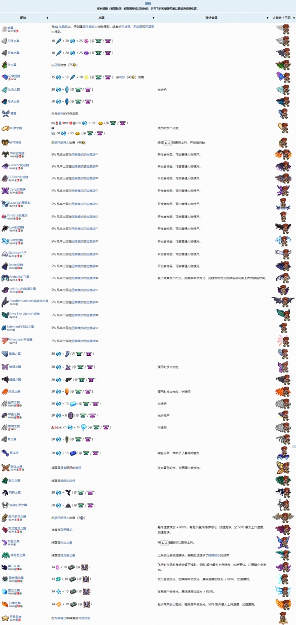 除了雛翼以外,所有的翅膀都是困難模式(肉山後)才能獲得的,並可飛行和緩慢墜落以及抵消掉落傷害。