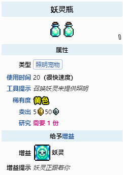 妖靈瓶是個困難模式、世紀之花後的照明寵物物品,用於召喚跟隨玩家的發光妖靈。激活時,它類似於閃爍燈芯。除了可疑觸手和光之珠寶具有相同的光照半徑外,妖靈比其他照明寵物更亮且能和更好地與玩家維持同步。它會按照玩家按下的方向鍵移動。妖靈的移動範圍大致上是玩家碰撞框向下、向左、向右 7 格以及妖靈的正常起始位置向上 7 格。