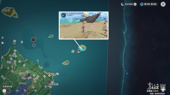 位於神裡屋敷的右邊的海域,需要開船過去,且就一個緋櫻繡球,所以不建議去採集。