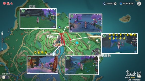 鳴神大社上面繞一圈後,注意觀察最後兩個點的位置。倒數第二個點的位置,是貼近山體的,在下落的過程開啟元素視野,方便找尋此緋櫻繡球。