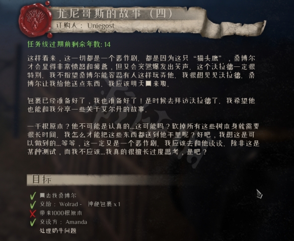 要完成尤尼哥斯的故事中帶來1000根原木的任務,只需要在接到任務目標後再次和沃拉德對話就好了,仔細看任務說明就能知道,因為他其實是在和你開玩笑。對話後遊戲就會自動跳過這個任務目標,可以繼續下一步任務。