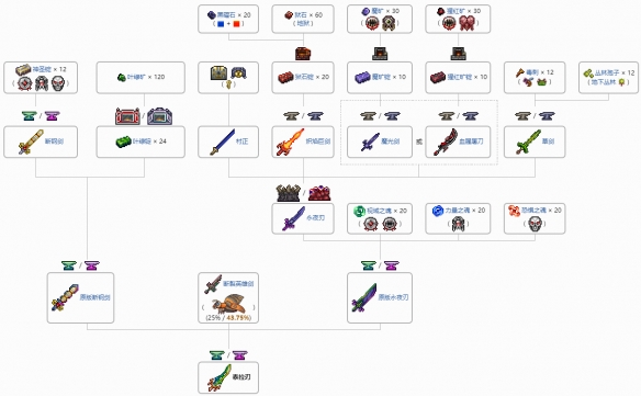 要合成泰拉之刃的話,建議在肉山後就提前開始規劃,隨著游戲進程逐步獲取所需的所有材料,而不要等到所有材料都可用時被迫搶著去收集所有東西。
