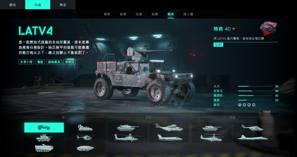 首先是載具的定位,就如遊戲中的簡介,LATV4是遊戲中最弱的載具,裝甲爛到不能再爛,屬於武裝載具食物鏈的底端。