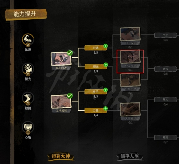 在游戲中打開技能樹界面,在解鎖中間的“躺平人生”技能組後,在能力里點出溝通,再點出“分發傳單”的職業技能,之後就可以成功應聘發傳單的職業了。
