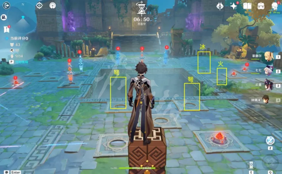如下圖,開始在入口位置2個火拆掉,前面中間的2個震弩拆掉,然後紅色標記7個點擺上機關,即可開始,等攢到積分了,先擺右邊的冰和火機關,然後再擺入口處的2個震弩機關。全部擺完即可掛機拿滿3000分了。其他不用擺。