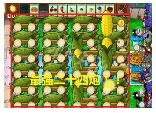 如果上方的十六炮陣容就已經足夠強了,那二十四炮的玉米加農炮會讓你目瞪口呆。甚至你的雙手根本無法解放,所要做的就是點擊玉米加農炮再點擊殭屍。有沒有覺得殭屍突然變成了弱勢全體,不知道製作這么多的玉米加農炮需要花費多少點陽光。註:需要注意小鬼襲擊。
