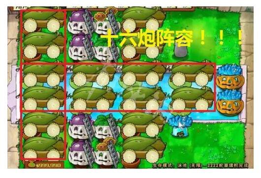 玉米加農炮可以說是植物大戰殭屍中傷害最高的植物,有玩家便研究出十六炮陣容玩法。將玉米加農炮依次排列,再用萵苣與憂郁噴菇進行配合,達到完美的效果。如果你還不放心,可以再加上幾個冰刺菇,用來幫助玉米加農炮更好的冷卻回復,強!